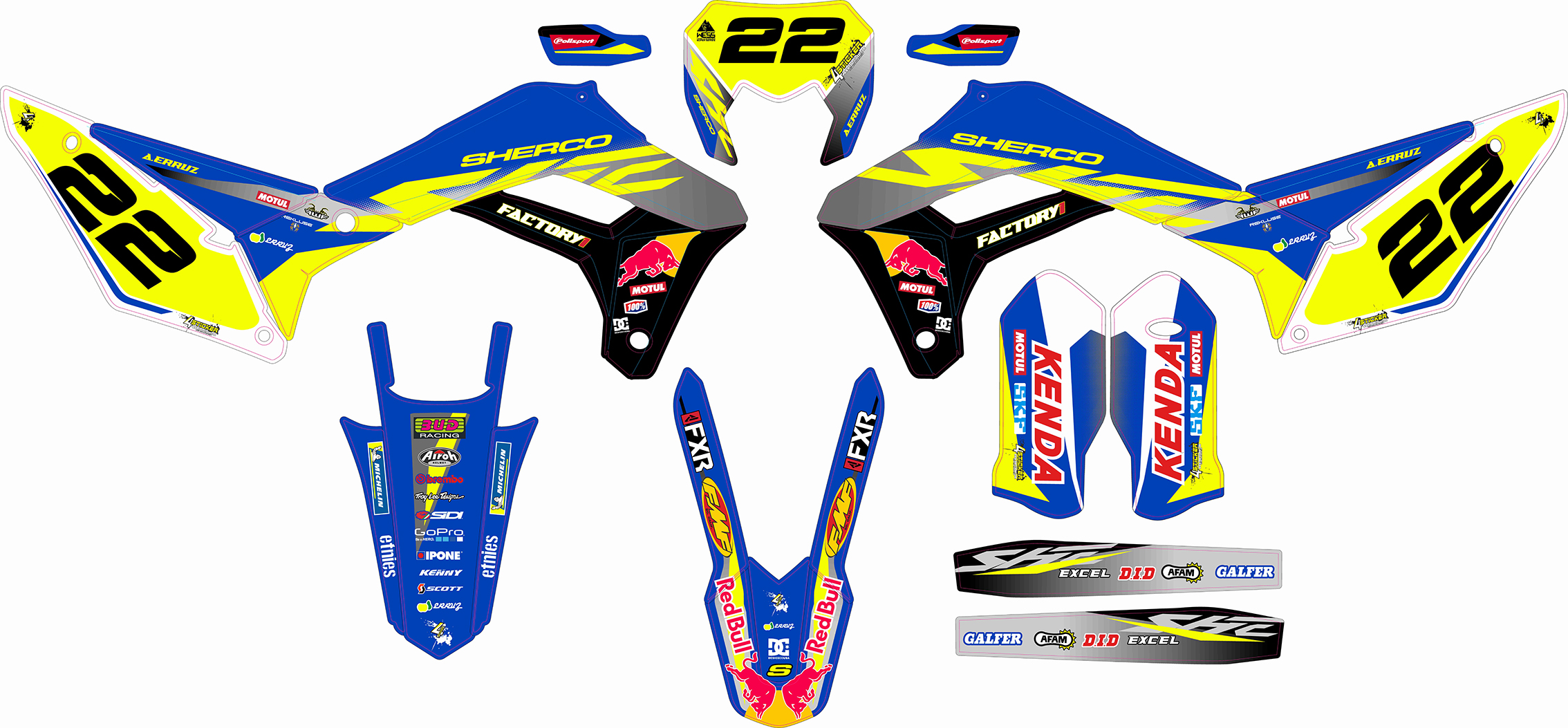 Kit completo de adhesivos para Sherco SE modelo 2021, con diseño estilo factory en colores azul, amarillo y negro, e inspiración Red Bull / Bud Racing. Lleva el dorsal número 22 y una combinación brutal de logos de competición como FXR, Kenda, Motul o Galfer.
